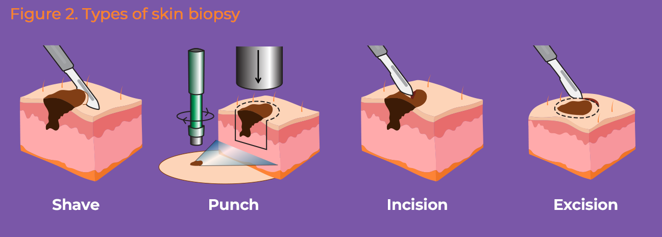 Your doctor will make your diagnosis after a physical exam and a biopsy. A biopsy is when your doctor takes a sample of cells or tissues to view under a microscope.1 Types of biopsy your doctor may do are shown in Figure 2. Your doctor can tell you more about these, which one they will perform, and why.1,4
