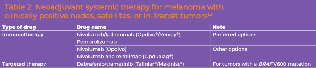 Preferred regimens in the guidelines include nivolumab plus ipilimumab (category 1) and pembrolizumab (category 2a).3 Clinical trials supporting these options are summarized in Table 3.16-19 Other regimens include nivolumab with or without relatlimab and dabrafenib plus trametinib for BRAF V600-mutated melanoma (all category 2a).3 Neoadjuvant pembrolizumab did not significantly increase toxicity in the perioperative period compared with adjuvant therapy, and surgical outcomes were not negatively impacted. Overall survival data are not available yet. The United States Food and Drug Administration (FDA) has not approved these regimens, pending the completion of randomized phase 3 studies.