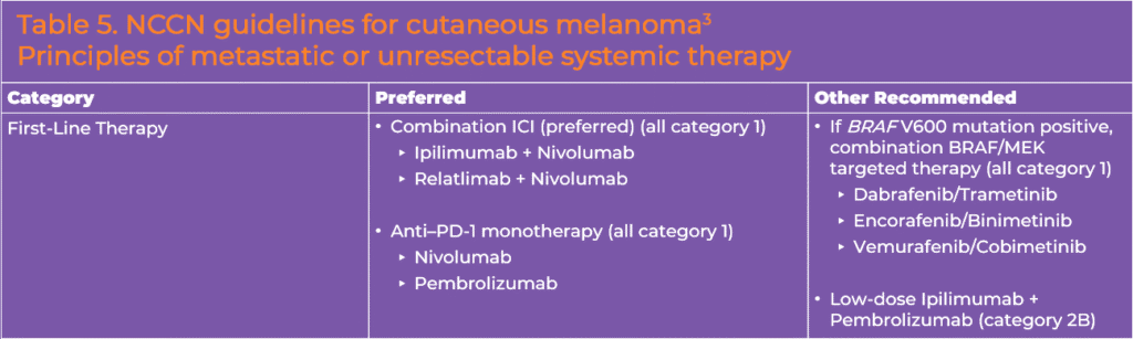 Preferred regimens in the NCCN melanoma guidelines are nivolumab/ipilimumab (category 1), nivolumab/relatlimab (category 1) or ICI monotherapy with pembrolizumab or nivolumab (category 1).3 Of note, combination immune checkpoint blockade is the preferred first-line approach. Other recommended first-line regimens include BRAF/MEK combination targeted therapy (dabrafenib /trametinib, vemurafenib/cobimetinib, encorafenib/binimetinib) for BRAF V600 mutation positive melanoma (all category 1).3 Pembrolizumab with low-dose ipilimumab is another option included in the guidelines as a category 2b recommendation.
