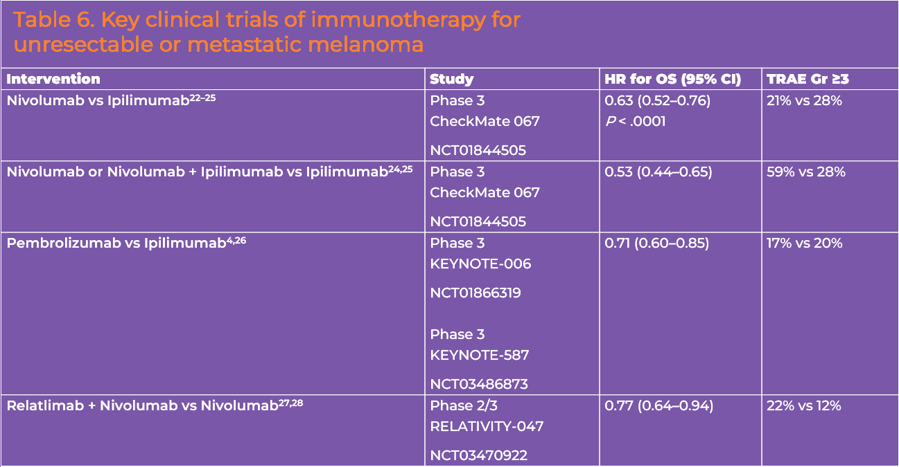Several ICIs are approved by the FDA for the treatment of advanced (unresectable or metastatic) melanoma, including PD-1 inhibitors nivolumab and ipilimumab, the cytotoxic T-lymphocyte antigen 4 (CTLA-4) inhibitor ipilimumab, and the lymphocyte activation gene 3 (LAG-3) inhibitor relatlimab (the latter is approved in a fixed-dose formulation with nivolumab). Each has demonstrated clinical activity and a survival benefit in randomized clinical trials (Table 6).
