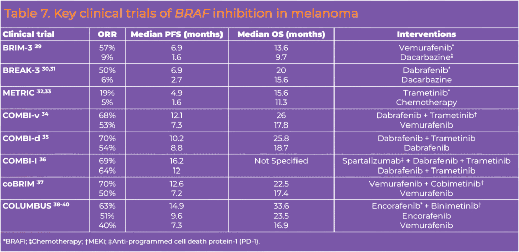 BRAF inhibition used in combination with MEK inhibition has been shown to improve PFS and OS compared with single-agent BRAF inhibition.